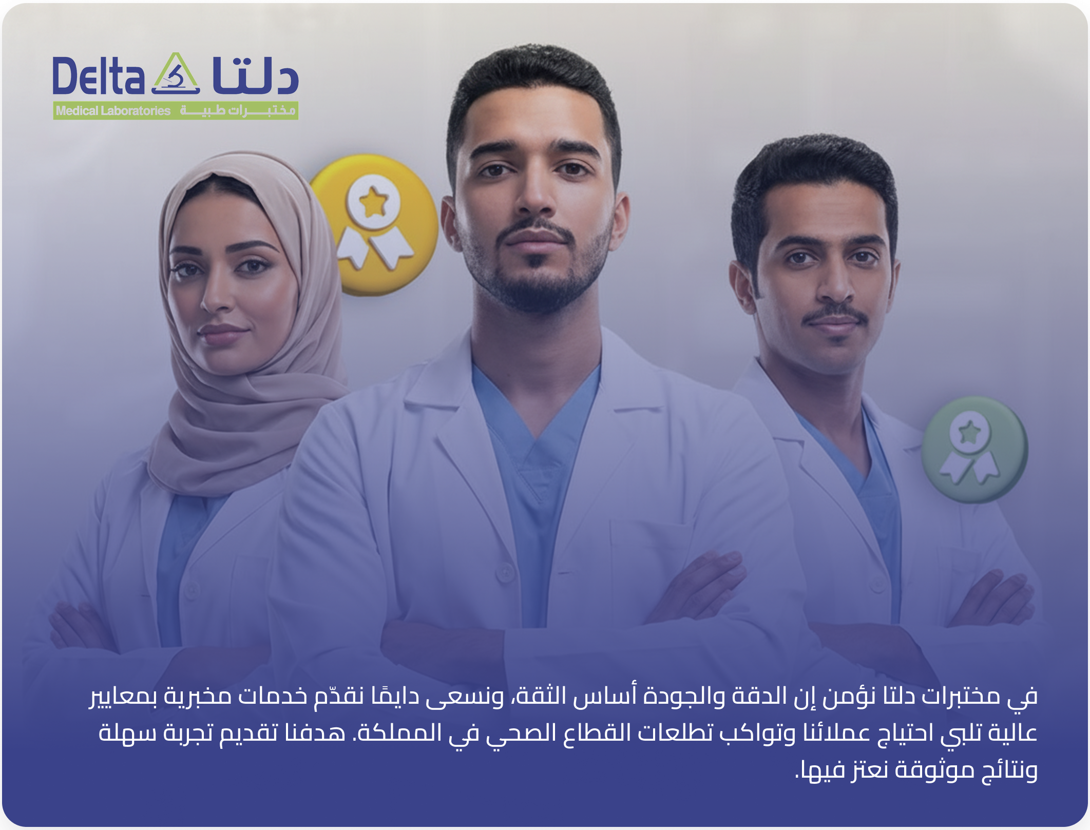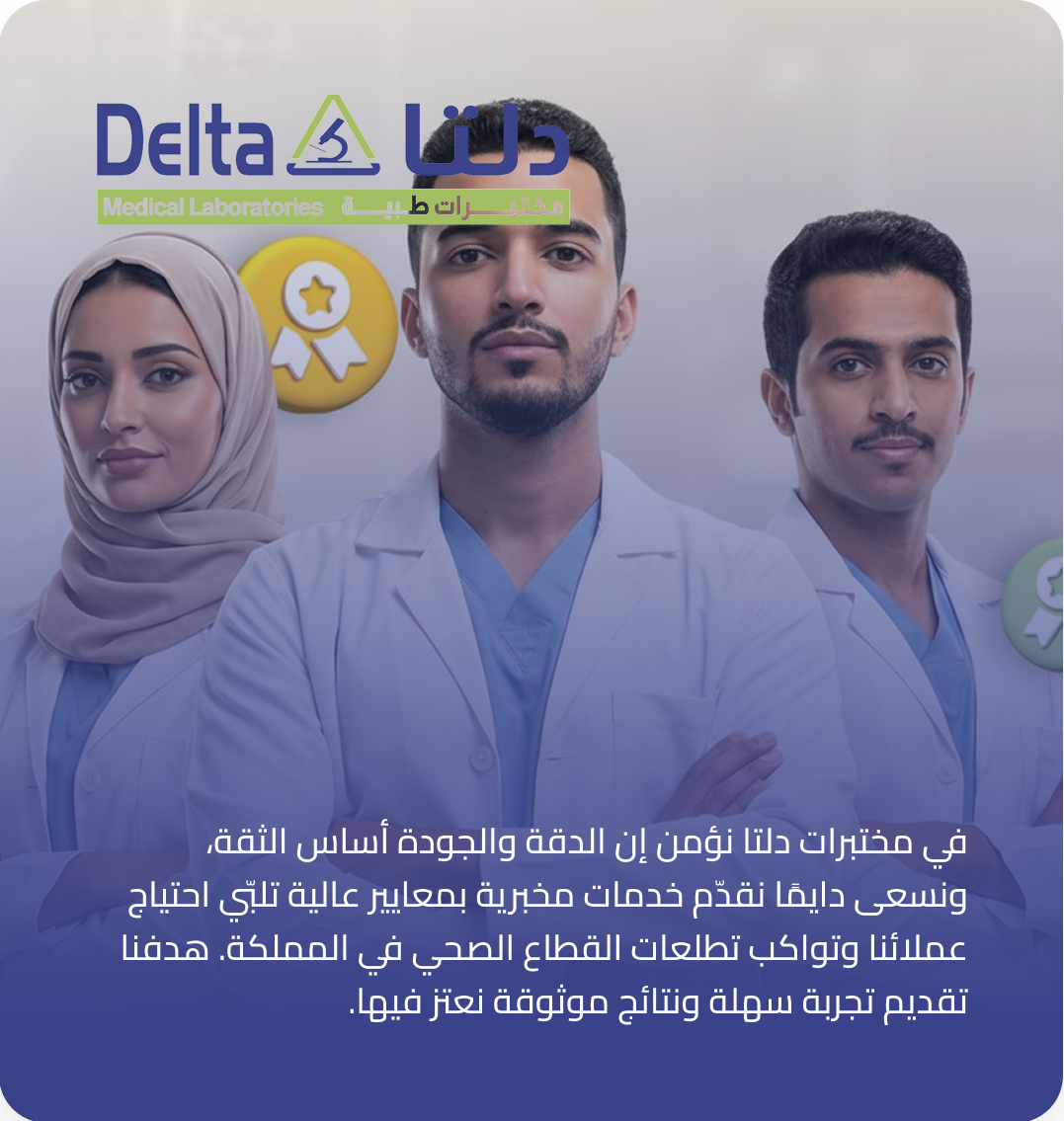 مختبرات دلتا الطبية مختبر متخصص في التحاليل، نعمل بمعايير عالية ونقدّم نتائج دقيقة تخدم الأفراد والجهات الصحية في مختلف مناطق المملكة.